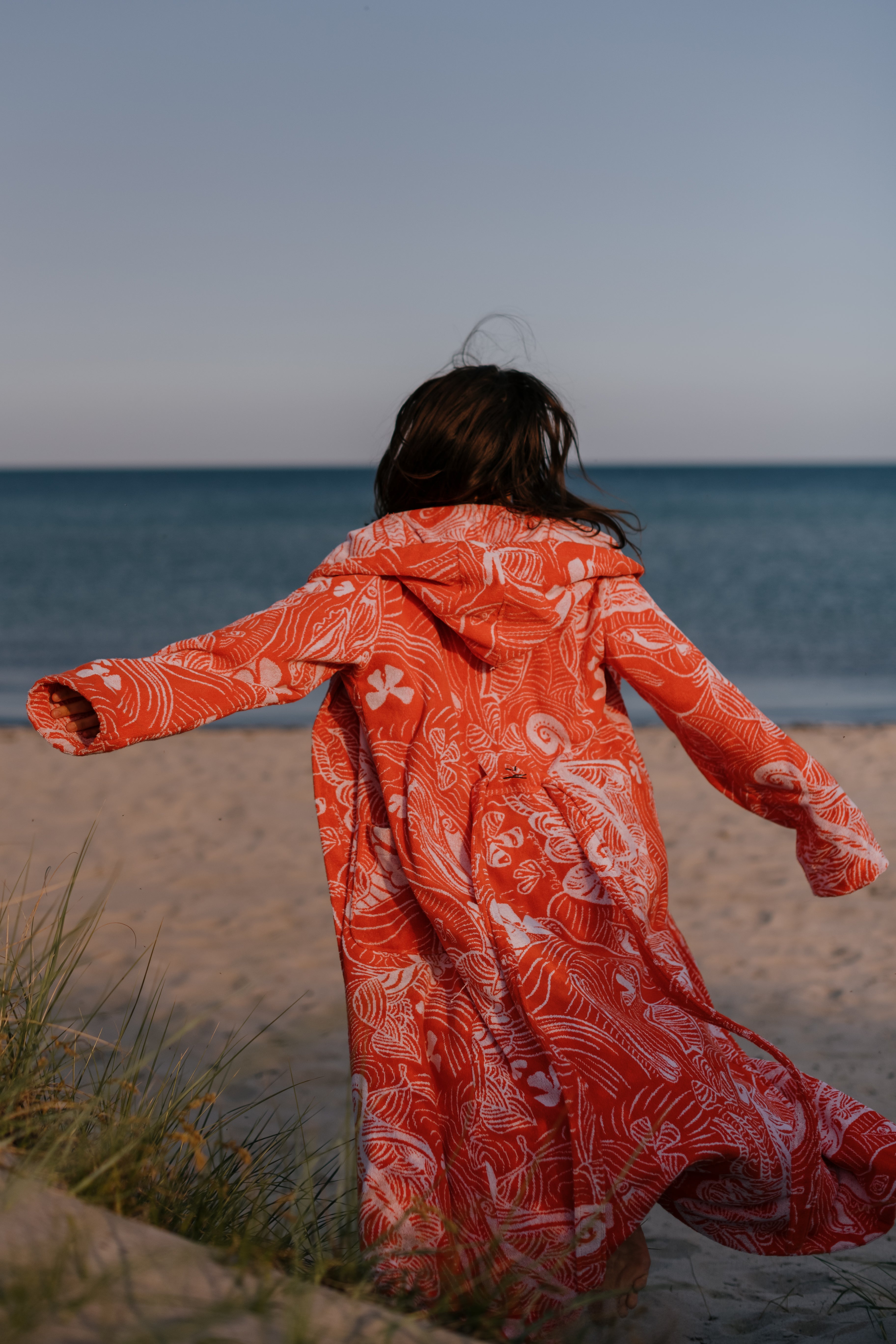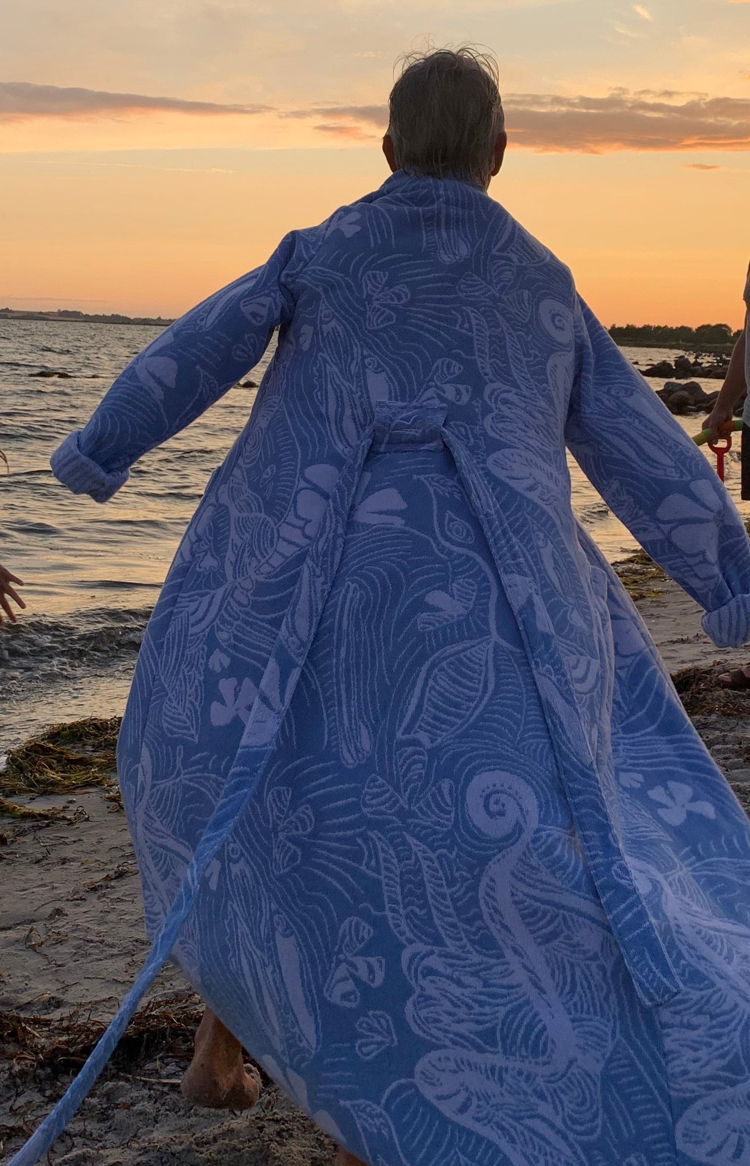 Mjuk och härlig badrock i frotté. Perfekt för mysiga morgonstunder och lata dagar vid havet. Hellång figursydd frottébadrock med rymlig huva. Två knappar i trä och skärp med fästning i ryggen gör att badrocken kan bäras som en nättare badkappa eller mer omslutande på kroppen. Finns i färgen Rönnbär och Förgätmigej.